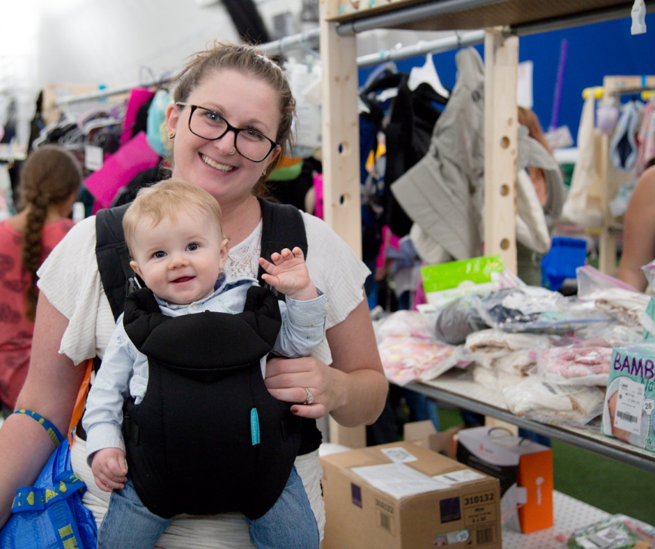 Three generations shop together at their local JBF sale. Mom carries baby in a baby carrier while grandmom stands behind them.