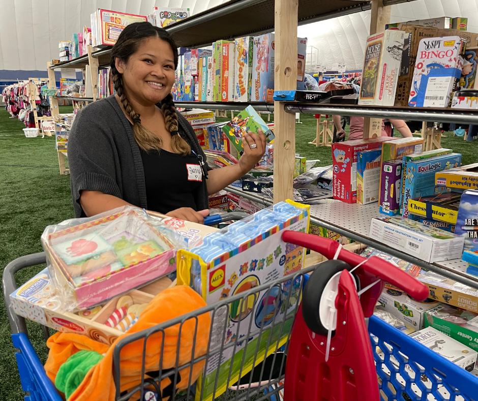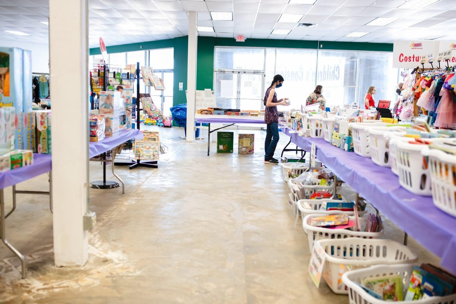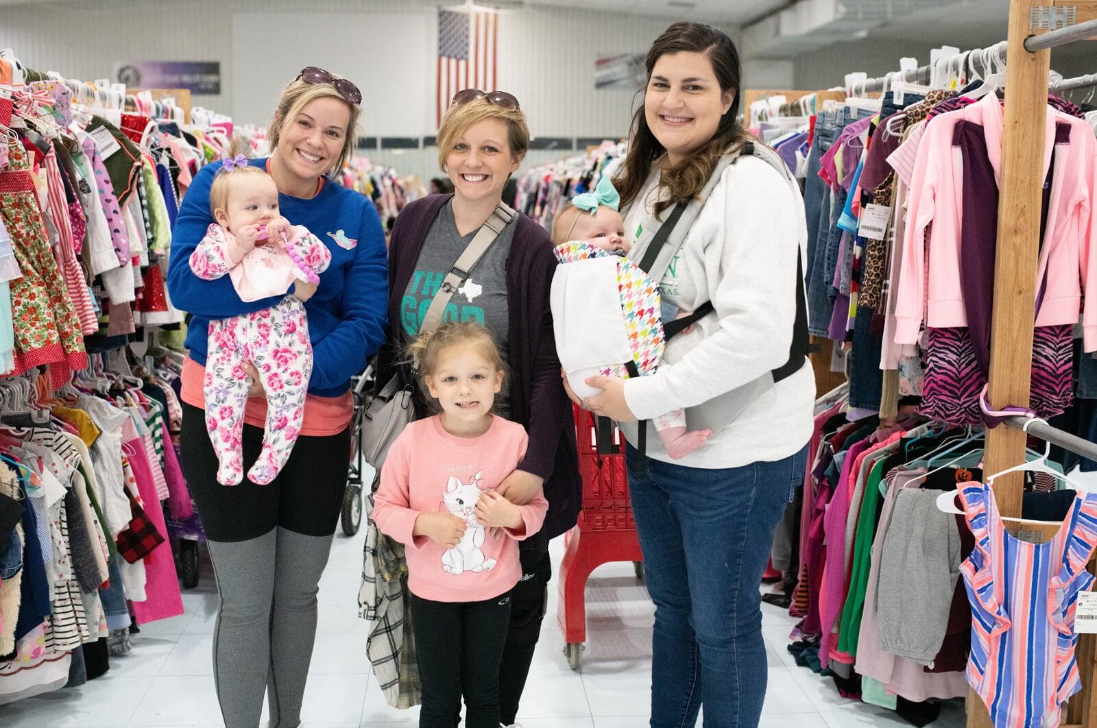 A mom and grandmother stand beside a rack of clothing at a JBF sale in Texas.